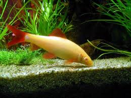 Dit is een leuke soort “haaiachtige” vis zoals veel mensen hem noemen, het is natuurlijk geen haai. Maar heeft zeker de soort vorm. Is best een leuke vis die je af en toe voorbij zult zien zwemmen, wel is een groter aquarium nodig omdat ze toch een flink formaatje kunnen krijgen. Dit is de albino variant. Dus heeft die een wit lichaam met rode vinnen en ogen.