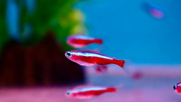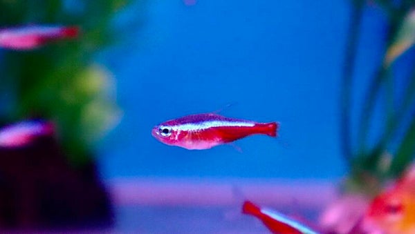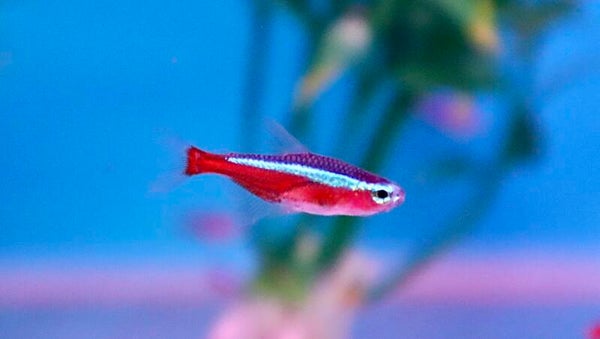 De klassieker, de kardinaal tetra, anders dan de neon tetra. De kardinaal tetra is namelijk gekenmerkt door de twee horizontale strepen van blauw en rood. Terwijl de neon tetra 3 kleuren heeft in driehoeksvormpjes, namelijk rood, wit en blauw. Kardinaal tetra zijn scholenvisjes en willen in een groepje van minimaal 6 zitten.